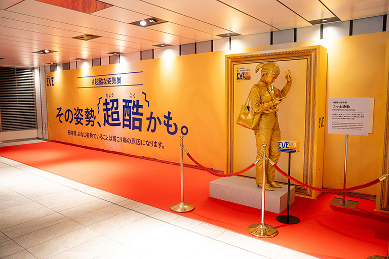 駅構内でパフォーマーが静止した彫像のように、肩こり痛などの原因となる「長時間の同一姿勢」を再現した企画です。 パフォーマーの登場しない時間帯は通常のOOHとして展開します。また、パフォーマーの脇に「魔法のコイン入れ」を設置し、専用コインを入れると固まっていた姿勢が動き出す演出も用意されました。