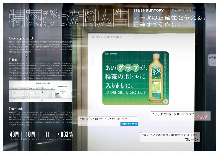 サントリー「特茶」のボトルに「体脂肪低減効果を示すグラフ」が追加されたことを伝える交通広告。都営線の電車ドアに貼られた「あの○○○が…」というステッカーが、駅停車時にホーム上の看板とぴったり重なることで「グラフ」という文字が完成する仕掛け。停車時の一瞬にだけメッセージが完成する驚きで、新機能を印象づけている。