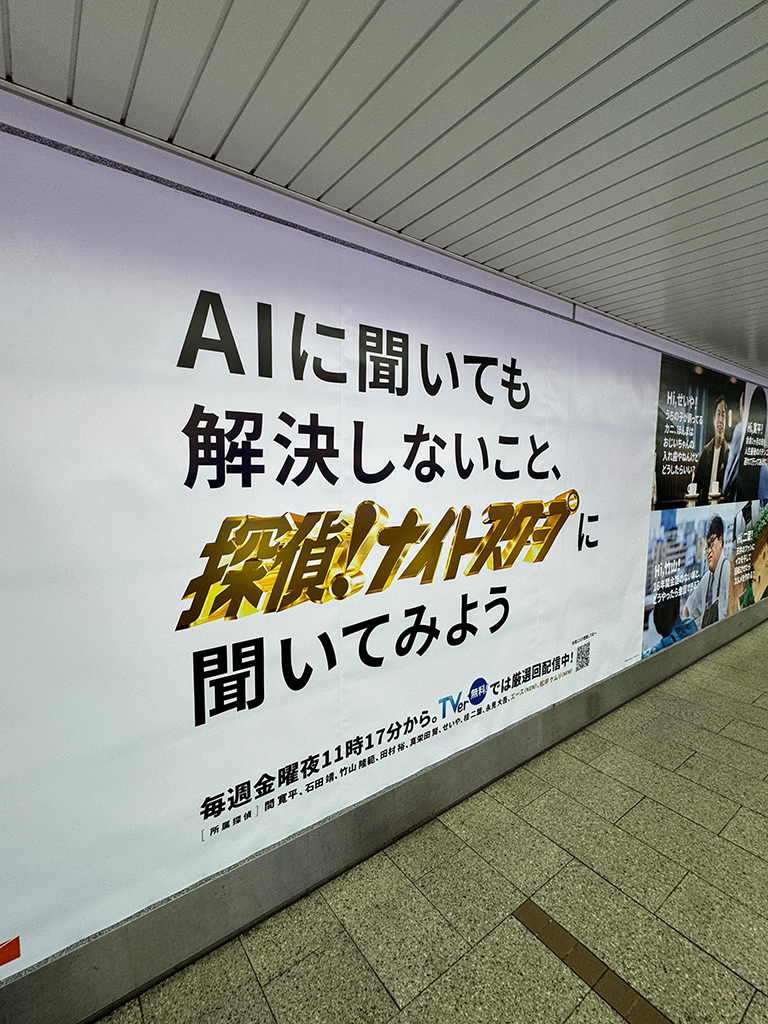 視聴者から寄せられたさまざまな謎や疑問を究明してきたテレビ番組『探偵!ナイトスクープ』のOOH・SNS広告企画。新たな探偵の加入にあわせ、これまで番組内で実際に解決してきたエピソードの中から、「AIに聞いても解決しなさそうなこと」を掲出。該当回を期間限定で配信するキャンペーンも展開。